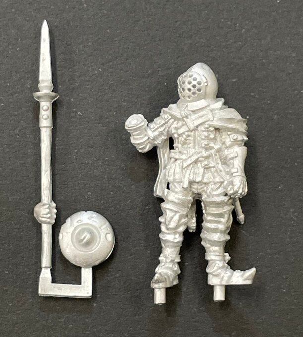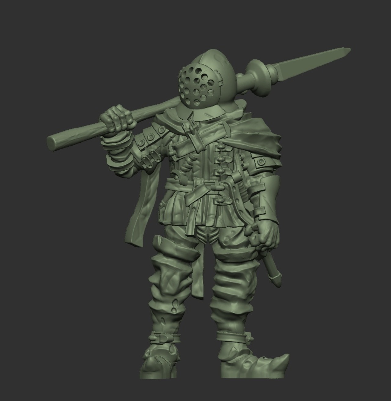 ドイツのイラストレーター「Axel Sauerwald」様がSNSで発表した「Ahlspiess」を私が趣味でモデリングしたものを、販売にあたり正式に契約を結ばせていただきミニチュア化しました。独特の面貌、画像ではわかりにくいですが四角錐の貫通に適した槍で武装した戦士はおそらく、今までにない雰囲気のミニチュアに仕上がったと思います。デザインの都合珍しくパーツ分割しましたが、そのおかげで盾もメタルで付属しております。