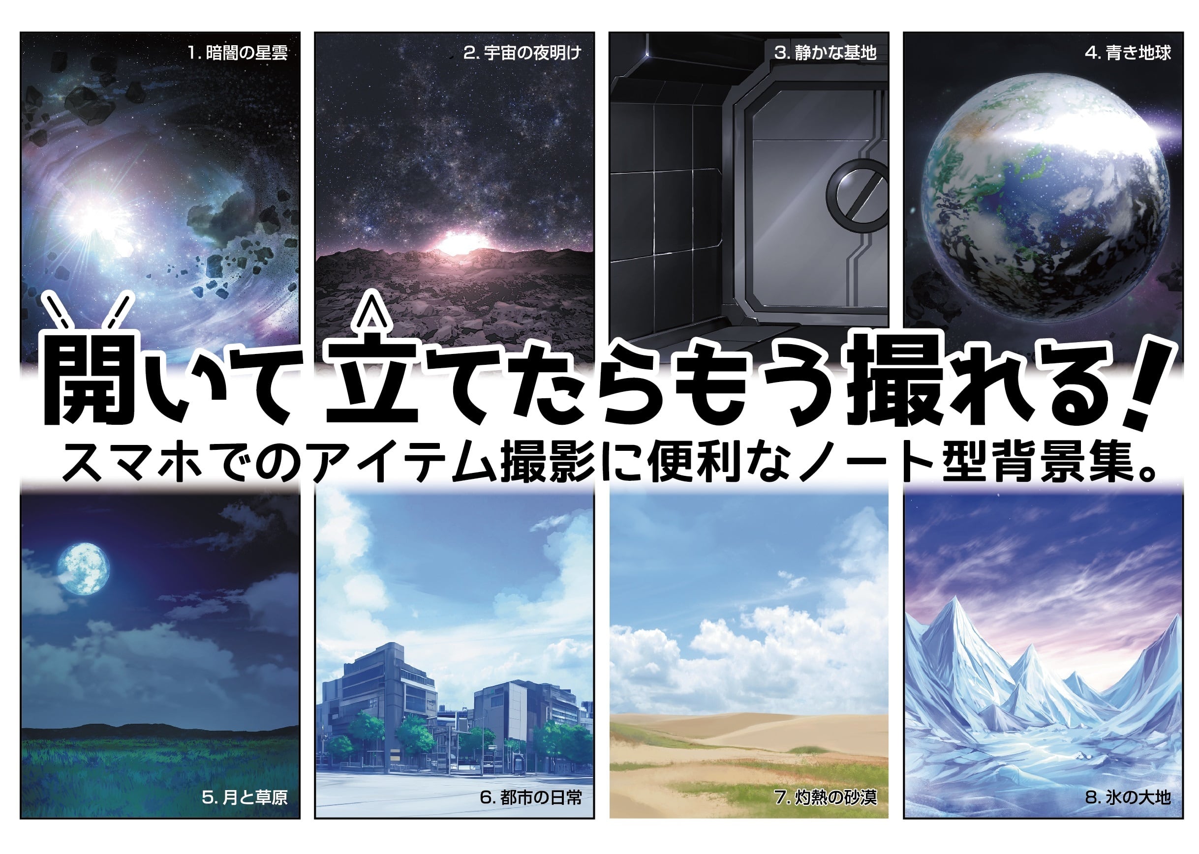 「物撮りノート」は、スマホ等で撮影する写真を手軽に見栄え良くできるノート型の背景集です。お好みのページを開いて被写体の後ろに自立させれば、簡便な背景スクリーンになります。A4ノート型なのでかさばらず、一瞬であなただけの撮影スタジオを準備できます。SF1「ロボット」には様々なシーンに対応した8種類の背景を収録していますので、これ一冊で様々なSFシーンの撮影にご対応いただけます。